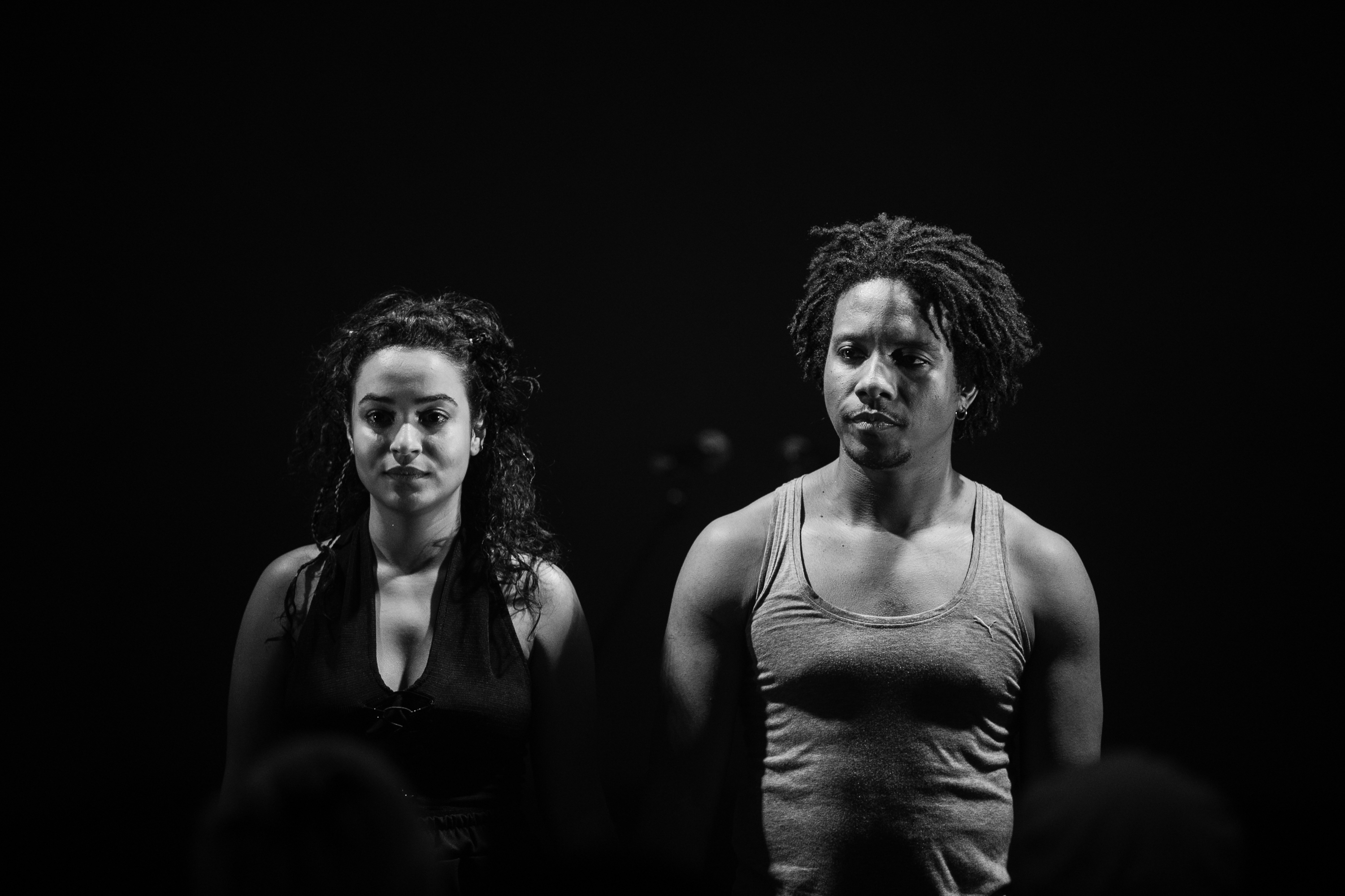 A peça, dividida em duas partes, propõe um encontro e embate entre os dois. E, para garantir o caráter atemporal da obra, os personagens são pós-coloniais, sendo ele atravessado por vozes como a do psiquiatra da Martinica Frantz Fanon, que repensou o racismo; a do artista visual estadunidense Jean-Michel Basquiat; do também martinicano Aimé Césaire, poeta, dramaturgo, ensaísta e político da negritude; e a do rapper brasileiro Mano Brown. Ela, por sua vez, é inspirada por nomes como os das filósofas e ativistas brasileiras Lélia Gonzalez e Sueli Carneiro, e da cantora e compositora estadunidense Erykah Badu.