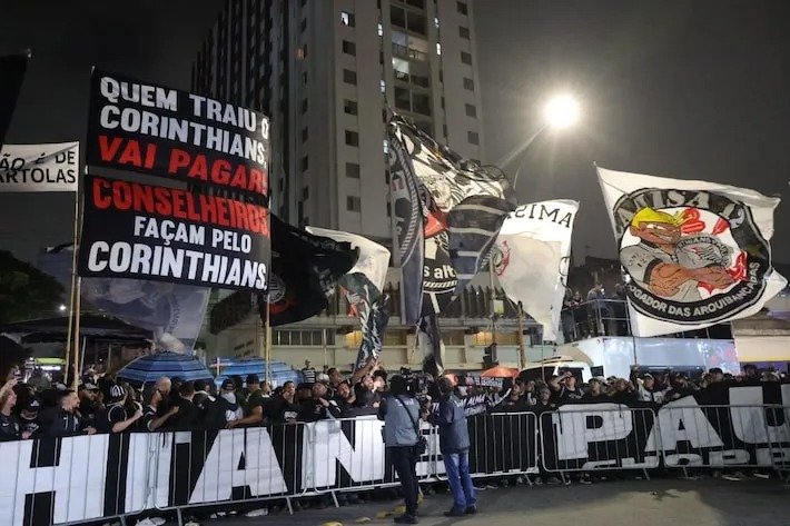 Torcedores organizados do Corinthians protestaram contra dirigentes do clube nesta quinta-feira, no Parque São Jorge, onde simularam o velório do presidente afastado Augusto Melo e do ex-presidente Andrés Sanchez, além de cartolas como Duílio Monteiro Alves, Roberto de Andrade e Mário Gobbi. Fotos dos alvos do protesto foram coladas em caixões, com labaredas de fogo em suas quinas, e bonecos.