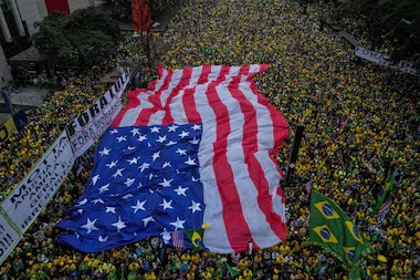 Bolsonaristas levam à Paulista bandeira gigante dos EUA e cartazes em inglês agradecendo Trump