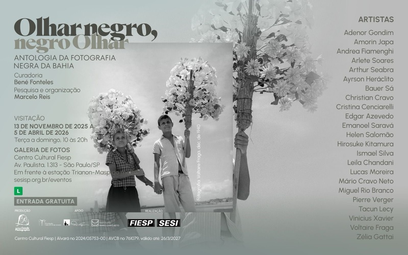 A partir do dia 13 de novembro, o público poderá conferir na Galeria de Fotos do Centro Cultural Fiesp, em São Paulo, a exposição "Olhar Negro, Negro Olhar — Antologia da Fotografia Negra da Bahia", um panorama sensível da fotografia produzida no estado. Com curadoria de Bené Fonteles e pesquisa e organização de Marcelo Reis, a mostra propõe um aprofundamento nas múltiplas camadas de significados sobre a negritude baiana.