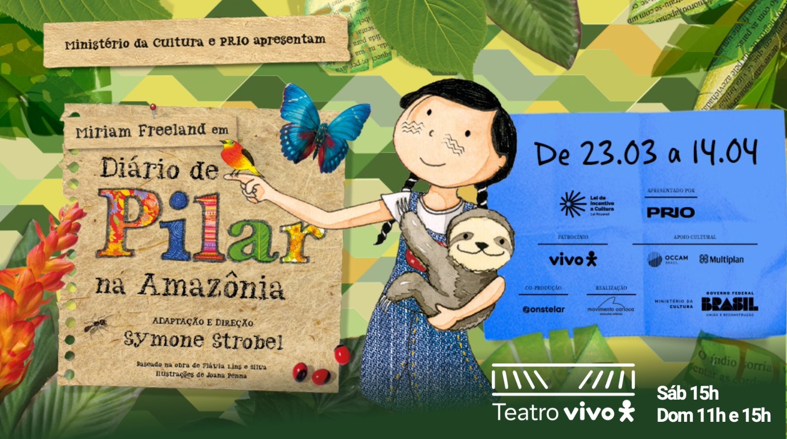 Depois do sucesso da menina Pilar na Grécia, Miriam Freeland volta aos palcos para levar a protagonista e sua turma a outro destino: a floresta amazônica. Com direção e roteiro de Symone Strobel, a peça estreia dia 23 de março no Teatro Vivo, em São Paulo, e segue em cartaz até 14 de abril. A peça é uma adaptação da obra homônima da escritora e roteirista Flavia Lins e Silva, autora da série literária Diário de Pilar e criadora da série Detetives do Prédio Azul.