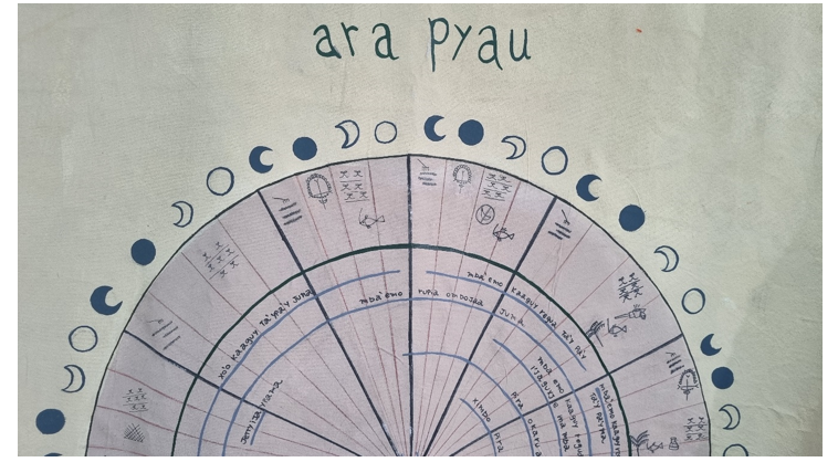 O calendário Guarani está ligado à trajetória da lua e segue as transformações da natureza. Diferente do calendário gregoriano, em que tempo é medido linearmente, os Guarani consideram a passagem do tempo cíclica, regidas pelas mudanças físicas e espirituais. O Ara Pyau (ano novo) é um período de fortalecimento e renascimento: “traz a renovação dos seres que vivem nas florestas, nele acontece o renascer das plantas, flores e árvores”, ressalta Natalício Karaí.