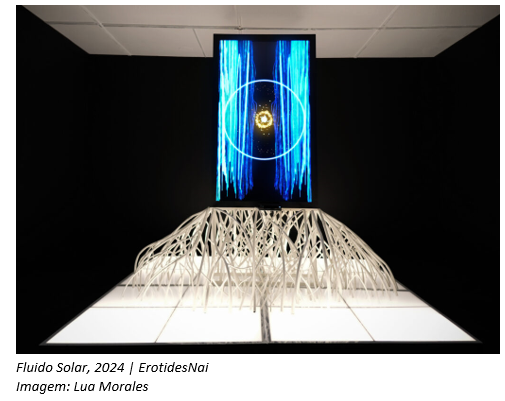Fluido Solar, da artista ErotidesNai, é uma obra participativa. Representa a busca pela iluminação, destacando o contraste entre o desconhecido e a luz interior de cada ser humano. A instalação desafia a bidimensionalidade ao flutuar no espaço central da sala. Transformando-se em um espelho interativo, a peça reflete a jornada do visitante, convidando-o à contemplação da própria essência.